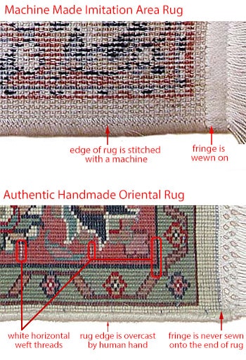 While the machine made rug has its edges machine overstitched and a fringe applied, the handmade Oriental rug has the edge overcast using the hand as the fringe is essentially the warp strings’ end and not one that has been sewn upon it. The machine made rug has overstitch patterns running across its back and distinguishing individual knots appearing on the back are not easy to find. In fact, for the machine-made rug, the overstitch construction is generally what keeps the pile material held together.