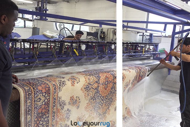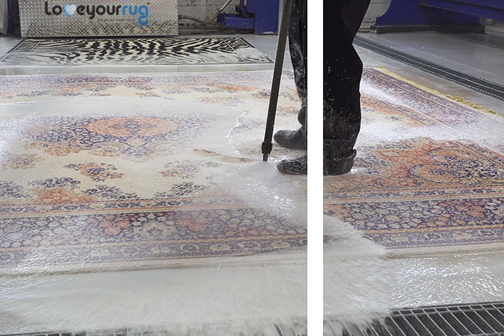 At home, you simply scrub up your area rug with shampoo after doing a quick patch test. One application of rug shampoo doesn’t necessarily mean all the dirt and stains will be cleaned. At Love Your Rug, we pre-treat each area rug with a safe and eco-friendly dual solution of soap and treatment before they are machine washed. This dual solution is applied by pressure washing each rug to soften and break down dissolved minerals that cling to your rug over time.
